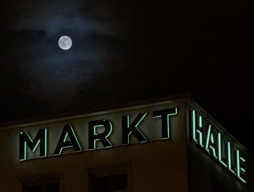 Last week when I was passing by Markhalle at night, I noticed the full moon shining brightly above the building. The combination of the modern lights of the "mark halle" neon light and the natural glow of the moon created a beautiful view that I tried to capture in the photo above.