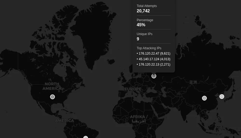 Nearly 31,000 failed login attempts from the top 20 IPs alone. Russia takes the lead with 45% of attacks (20,742 attempts), followed by the US at 30% (8,163 attempts). One particularly persistent Russian IP tried over 9,600 times. Points for determination, I guess?