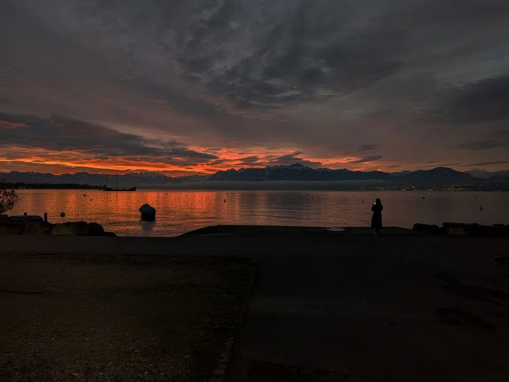 This morning the winter weather wasn't too bad, so I decided to grab my bike and do my commute using my favorite mode of transport. As I was passing by the Blancherie parking lot, I had to pull over and turn right—the sunset against the Alps in the background, reflecting off the calm waters of Lac Léman, was simply too beautiful to skip it. I took a moment to stop, wait a moment to admired it and then I shot the picture like you see above. As you can see with the lady on the foreground, I wasn't the only one taken by the view :)