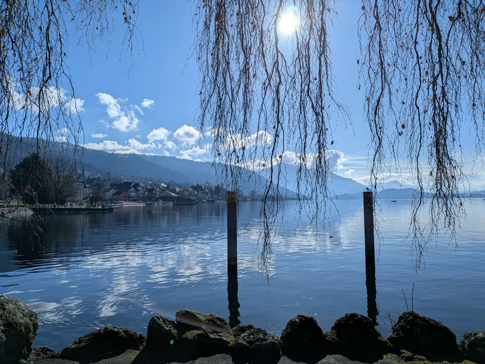 Sometimes you turn your head while walking and suddenly realize you’ve found the perfect photo spot. That’s exactly what happened yesterday along the shores of Lake Zug. The sun was out, the water was calm, and bare tree branches and the wooden posts framed a really nice view showing the edge of the lake, while the town of Zug and the surrounding hills were clearly in the background under a blue winter sky. It was really an amazing view!