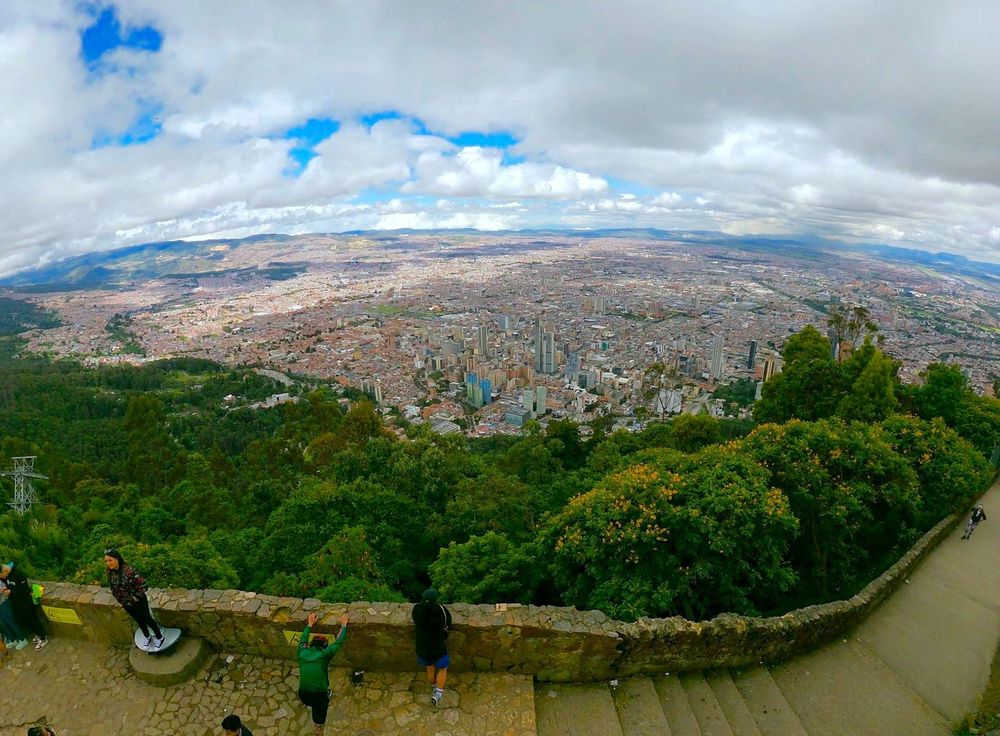 It's hard to capture the full scale of Bogotá even from this height, but I tried my best with my GoPro camera to get a fisheye view of the city. The picture shows the sprawling urban landscape, with its mix of colonial architecture, modern skyscrapers, and vast neighborhoods, particularly in the southern part of Bogotá.
